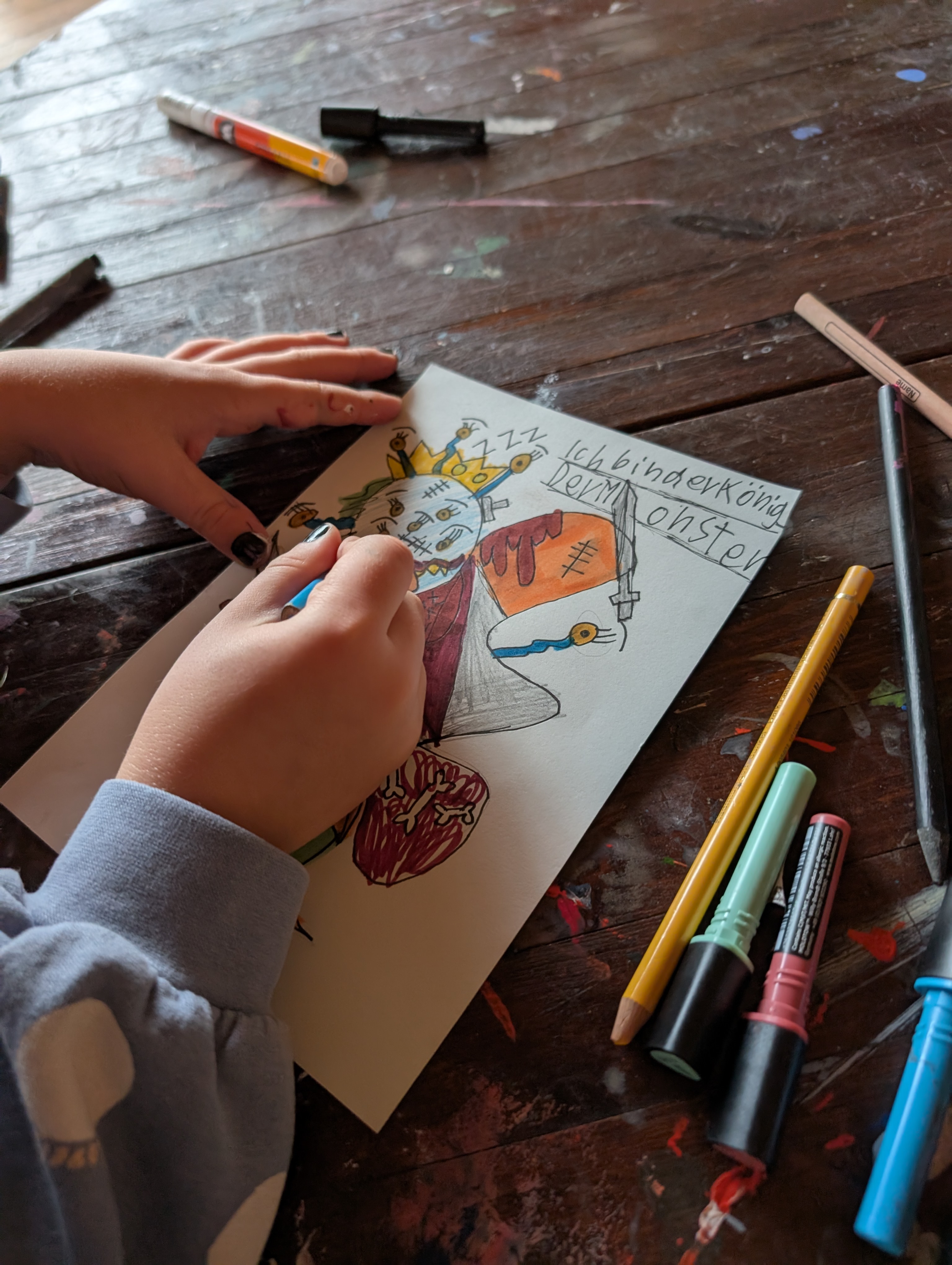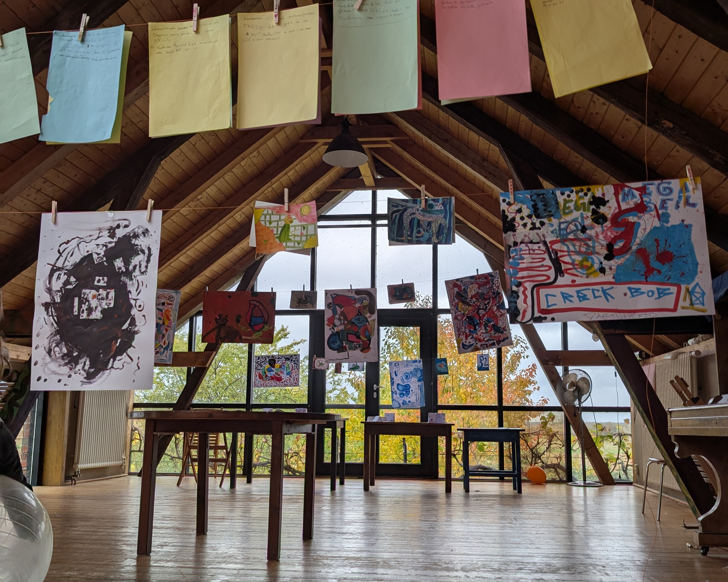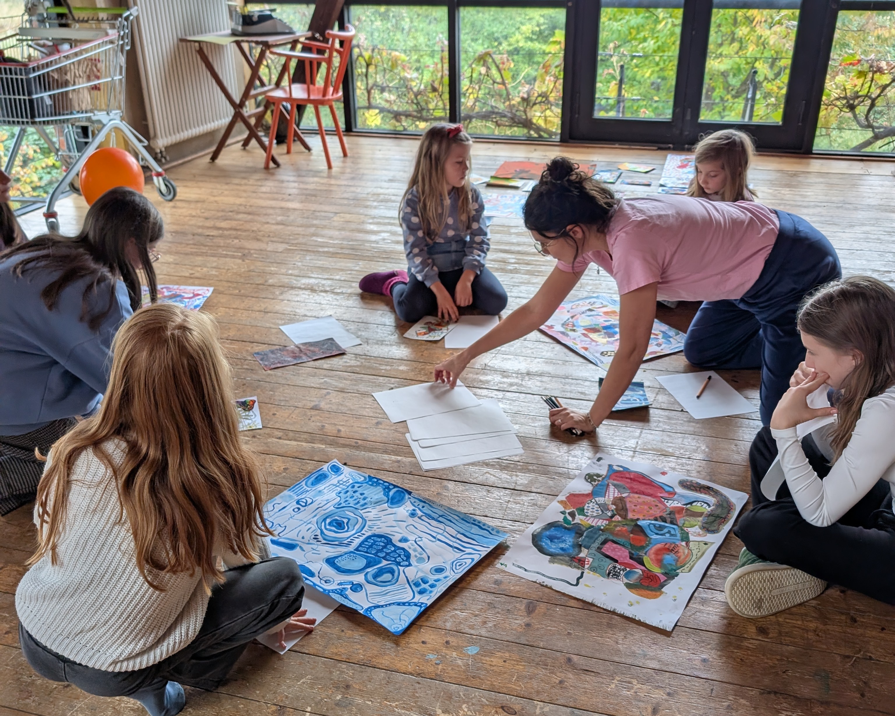 Ein zentrales Anliegen war es, Freiräume zu schaffen, in denen Kinder nach ihrem eigenen Tempo mitarbeiten oder zeitweise beobachtend teilnehmen konnten. Alle wurden in die Reflexion darüber einbezogen, wie man Kunst wahrnimmt, beschreibt und bespricht – ohne zu bewerten. So entstand ein wertvoller Lernprozess über Wahrnehmung, Akzeptanz und Sprache. Wir konnten die große alters diverse Gruppe nur so gut begleiten, weil wir viele Begleiter*innen waren und rund um die Uhr im Beziehungsarbeitsmodus.